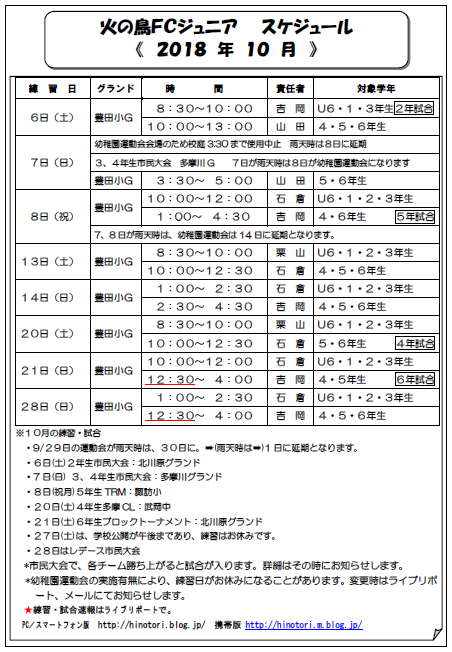 2018年10月06日 6日練習会 高学年の練習です。朝練の頑張ったで賞は、はやと、りゅうのすけ、はる、るい、さいぞう、なおとでした。良く頑張りました。6年生 10名5年生 17名4年生 14名今日は特別にキーパー専門コーチが来てくれました。 カテゴリなしの他の記事 < 前の記事 コメント コメントフォーム 名前 コメント 評価する リセット リセット 顔 星 投稿する 情報を記憶